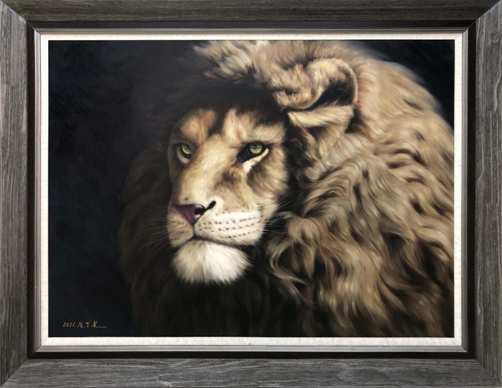 By setting the bright, sun-dappled lion against a dark, mysterious background, Kim Yingzhe employs “chiaroscuro” to heighten the drama. This lighting technique makes the subject “pop” from the canvas, emphasizing its regal features.