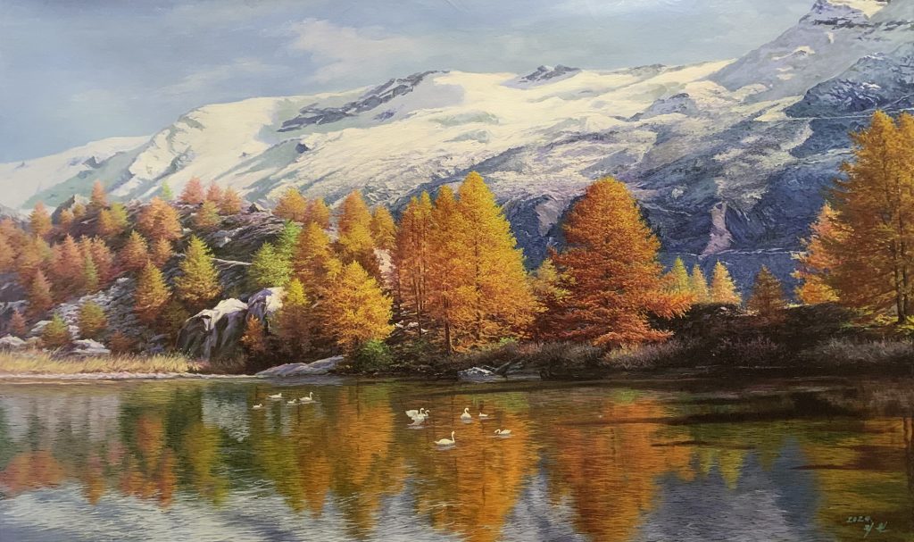 Autumn Reflections by the Snowy Peaks – Landscape Oil Painting by Ri Won