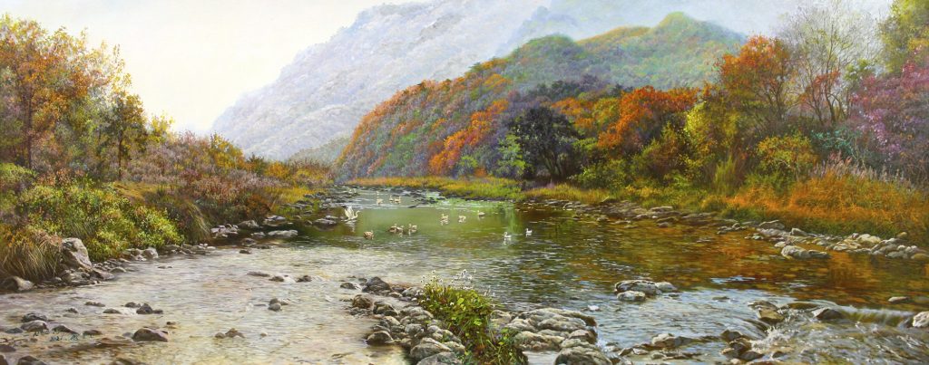 Autumn Reflections in the Mountain Valley – Landscape Oil Painting by DPRK Artist Ming Zhejin