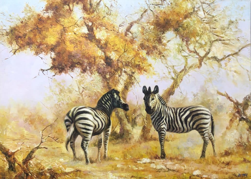 Discover Autumn Stroll of the Zebras, a captivating wildlife oil painting by DPRK artist Son Kyong Uk. Featuring two zebras in a glowing autumn landscape, this artwork blends realism with impressionistic warmth. Perfect for collectors and lovers of nature-inspired fine art.