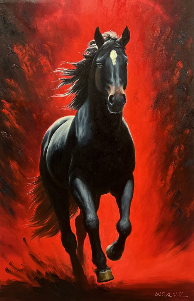 Crimson Charge is a striking oil painting by DPRK artist Kim Young Chul, measuring 74 × 115 cm. The artwork presents a black horse charging forward with commanding force, set against a blazing crimson background that amplifies the sense of speed, power, and intensity.
