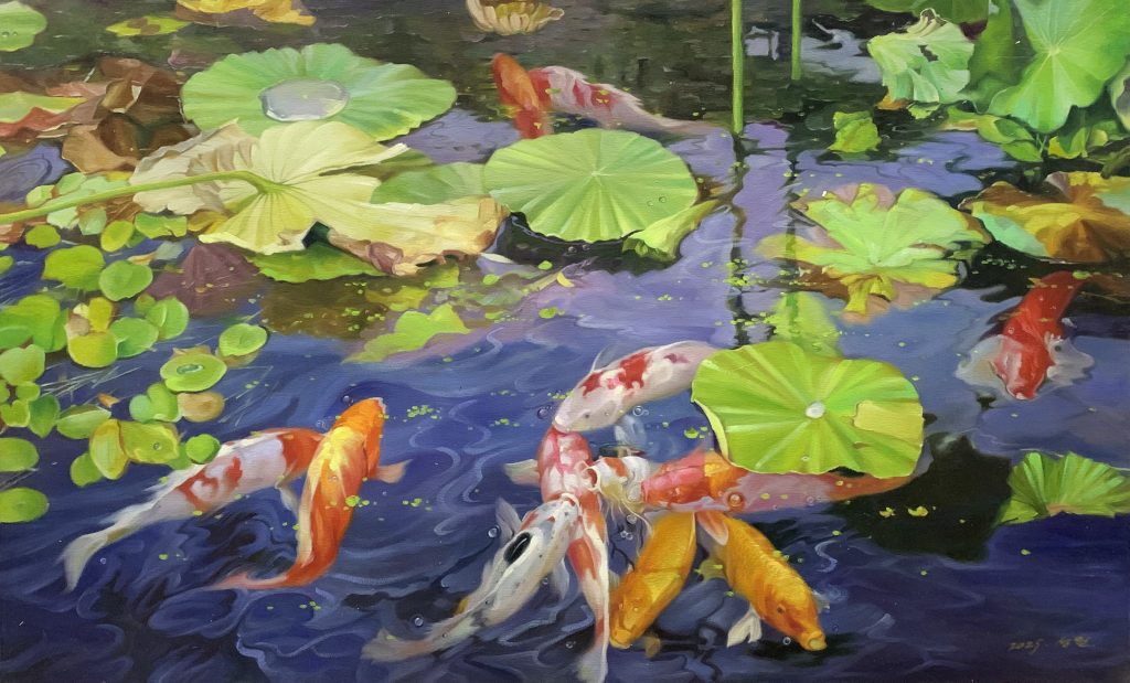 Each koi fish is painted with realistic detail, showcasing Seong Il’s strong understanding of anatomy, light reflection, and water texture. The shimmering surface of the pond creates a stunning contrast with the bold colors of the fish, adding depth and dimension to the composition.