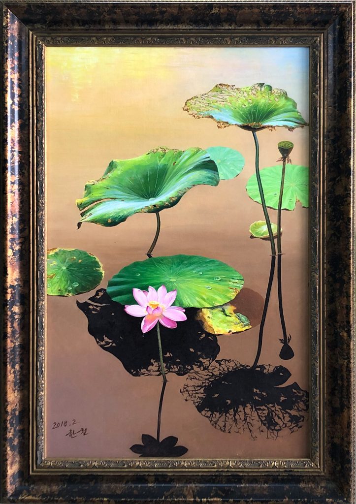 This lotus oil painting by North Korean artist Han Zhe (韩哲) captures a quiet moment of spiritual harmony. Measuring 56 × 88 cm, the artwork presents a delicate lotus rising gently from still water, symbolizing purity, resilience, and inner peace.