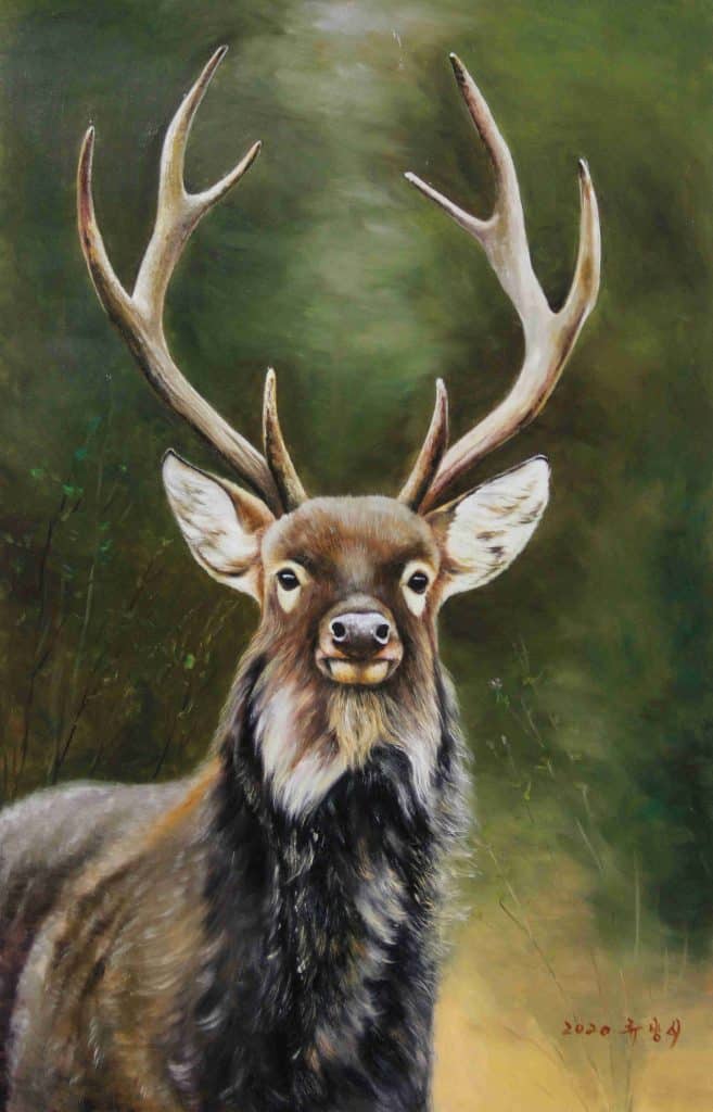 Liu Fangzhi, a respected North Korean artist renowned for his ability to portray animals with lifelike detail, completes this painting with exceptional skill. The commanding posture of the stag, its intricate fur textures, and the soft natural tones in the background combine to make this an unforgettable artwork.