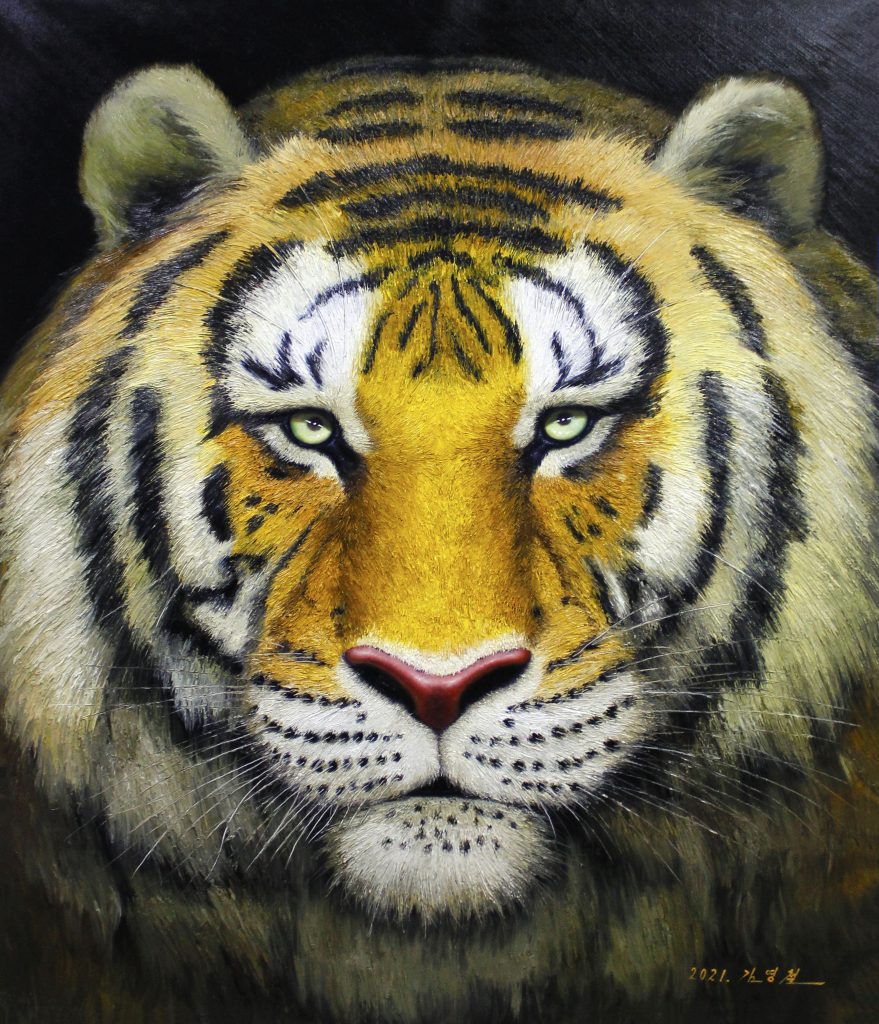 His mastery of oil techniques — from precise line work to layered textures — gives the tiger a vivid three-dimensional presence, while the rich, contrasting colors amplify its wild energy. This demonstrates Kim’s deep understanding of anatomy, light, and shadow, hallmarks of his artistic style.