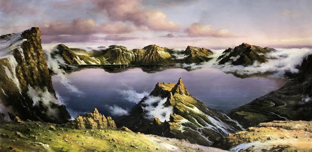 This mountain landscape painting captures a majestic dawn scene over Sacred Peak Lake, blending glowing skies, misty cliffs, and breathtaking natural beauty.