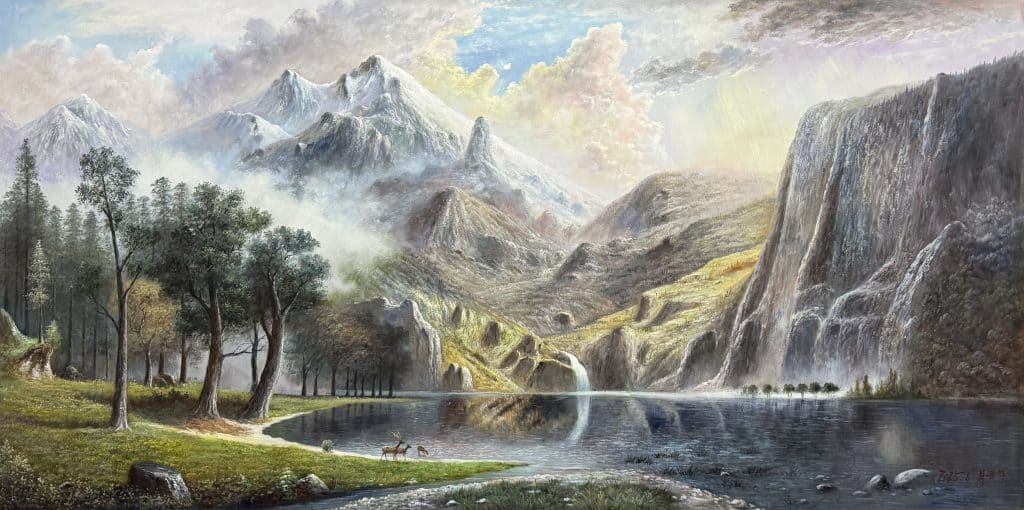 From the very first glance, this mountain landscape painting immerses the viewer in a world shaped by towering snowy mountains, dense forests, sweeping valleys, and peacefully grazing deer. The artist’s ability to combine dramatic terrain with serene atmospheric lighting makes this composition both visually striking and emotionally compelling.