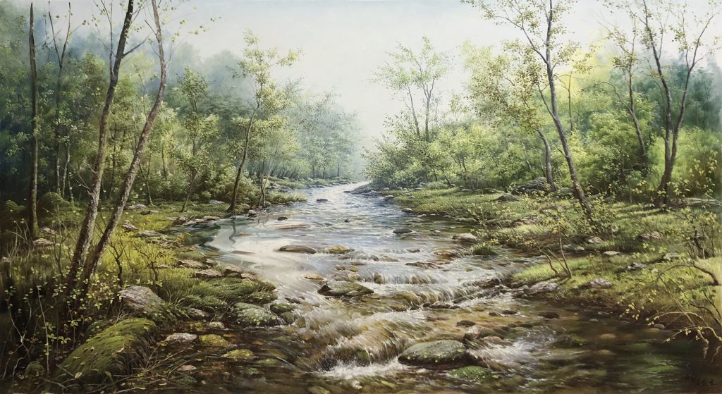 Jin Zhehao is a master of light and natural texture. In the world of contemporary realism, his ability to render water and foliage is almost unparalleled. This large-scale Nature Landscape Oil Painting showcases his dedication to the “Mansudae” style of precision while infusing a poetic, almost impressionistic softness into the light.