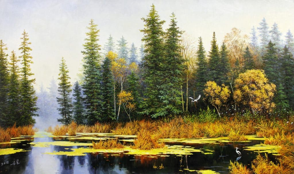 This exquisite oil painting by North Korean artist Seung Chol captures the serene beauty of a quiet autumn lake surrounded by dense forest. Measuring 163 × 95 cm, the artwork presents a breathtaking view of golden wetlands, tall evergreen trees, and gentle mist drifting through the background. Two elegant white herons add life and movement to the peaceful landscape.
