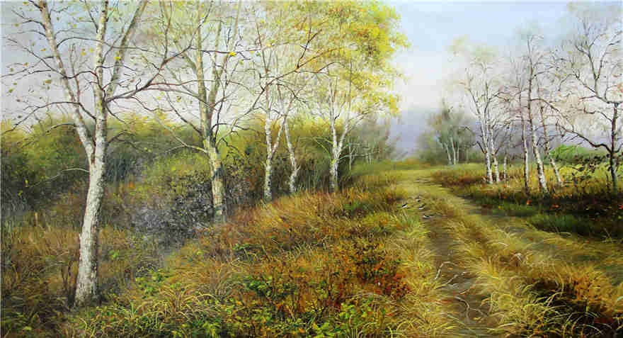 Quiet Path of Early Autumn is an elegant landscape oil painting by DPRK artist Kim Yoon Kyung, measuring 118 × 65 cm. The work depicts a gentle countryside path winding through slender birch trees, bathed in the soft light of early autumn.