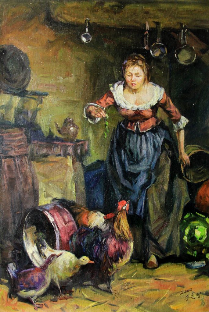 A beautiful 104*67 cm oil painting by North Korean artist Song Canhyeong, depicting rustic kitchen life with a woman feeding chickens. Warm, lively, and full of storytelling charm.