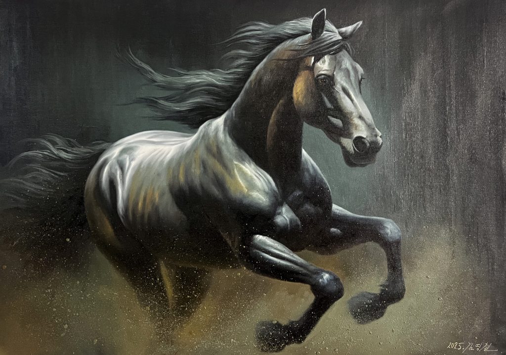 Unbridled Strength is a 116 × 83 cm oil painting by DPRK artist Kim Yong Chol. This dynamic horse artwork captures raw power, motion, and vitality through expressive brushwork and dramatic lighting.
