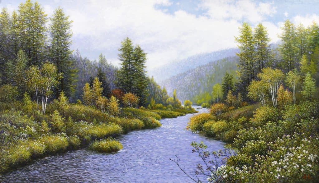The artist displays remarkable control over color and atmosphere. The river, painted in cool tones of silver and blue, becomes a natural pathway guiding the viewer’s eye into the distant mist-covered mountains. On both sides of the stream, dense vegetation blooms in vibrant hues—emerald pines, warm autumnal shrubs, and clusters of delicate wildflowers.