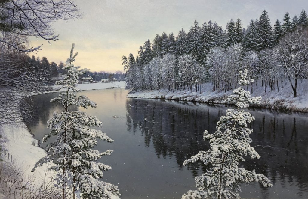 This winter landscape painting by Xu Yongfan is an extraordinary blend of realism, emotion, and peaceful winter atmosphere. With its soft dawn light, reflective river, and delicately snow-covered trees, it stands as a moving tribute to the quiet beauty of nature in winter.